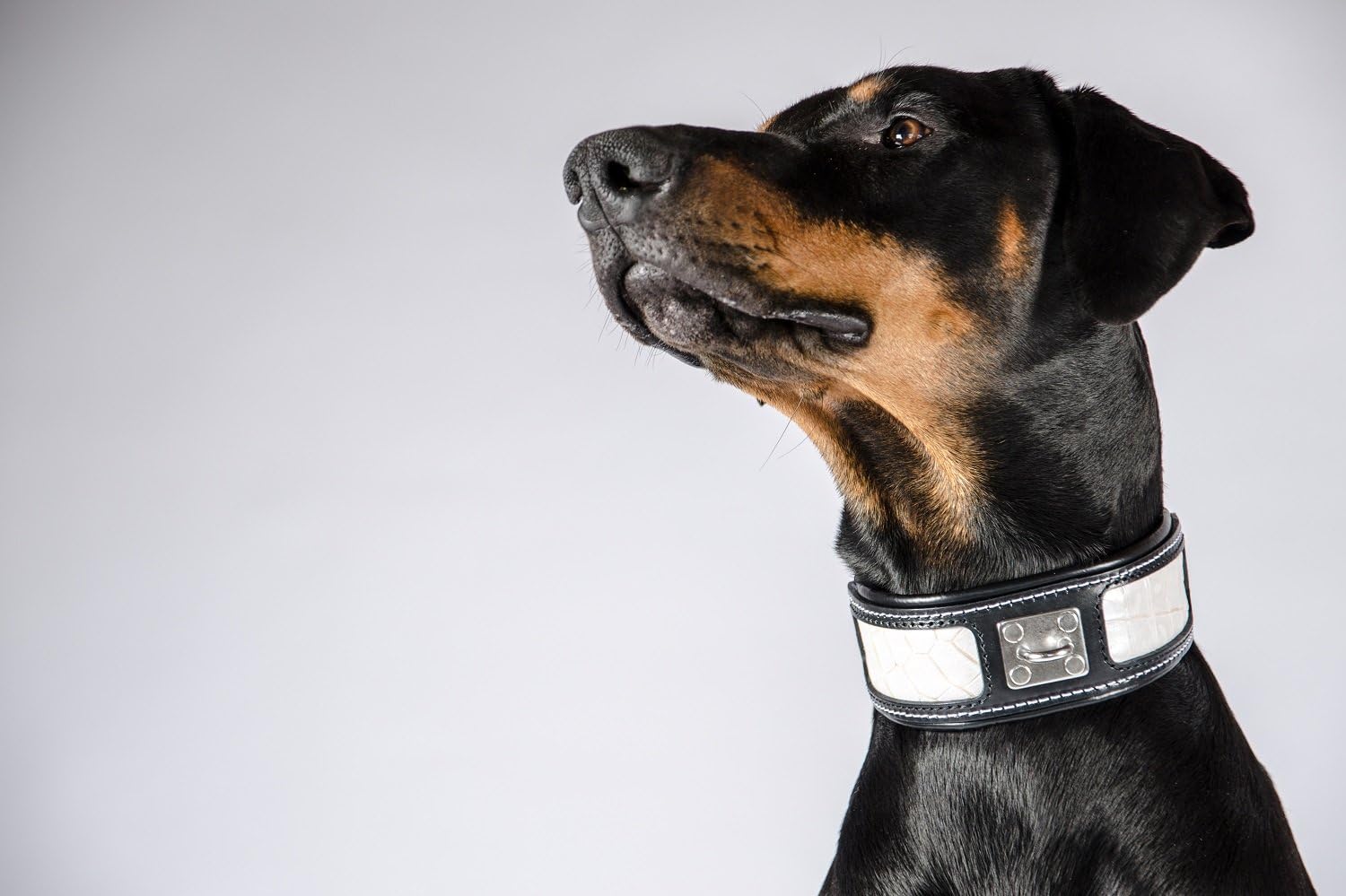 BESTIA Custom Dog Gear presents: The "reptiles" collars - as unique as your dog. The main layer of these collars is 4 mm thick belt leather of the highest quality, including a nappa leather decoration with reptile print in different colours. On the inside is our patented lambskin padding. The lead binding is in the middle of the collar of this model, is made of stainless steel and certainly holds up to a pulling force of 250 kg. In other words, it will never break or rust. The overall width of this collar, including padding, is 2.5 inches. Buckle and D-ring for sizes M - XL are 35 mm wide, for XXL size - 50 mm. All metal parts are nickel-plated, silver-coloured and very durable. 100% leather, soft padded, handmade, made in the EU, top quality guaranteed