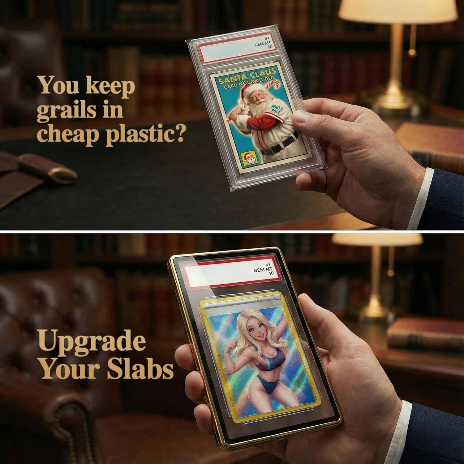 Designed to fit graded PSA Card Slabs. Plastic slabs scratch easy and feel cheap. Instead, guard your grails in our premium, aluminum body, chrome finish display case. Alumbinum body bumper and guard. Protect and showcase your valuable PSA graded cards with the Slab Clad Premium Metal Display Case. Crafted with precision from high-quality aluminum, this sophisticated display case bumper combines durability with elegant presentation. The magnetic closure system ensures secure storage while allowing easy access to your collectibles. The premium glass front offers crystal-clear visibility while providing essential UV protection to prevent card fading. The scratch-resistant construction maintains the case's pristine appearance even with regular handling. Whether you're a serious collector or just starting your collection, this display case offers professional-grade protection and presentation for your cherished PSA graded card slabs. The sleek metal design adds a touch of sophistication to any display setup, making it perfect for both home collections and retail environments.