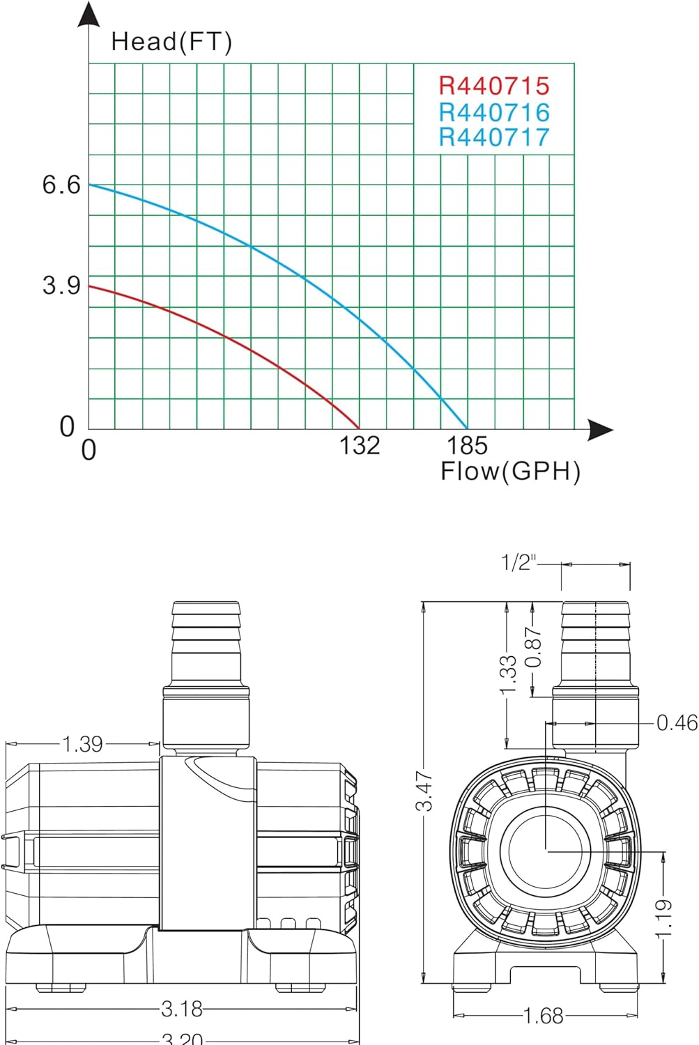 Quiet One DC Pump 475 GPH, Max Head 6.6', with Controller Part No. R440718 Model DC 475 with Controller GPH 475 Max Ht. Ft. 6.6 Voltage: DC 24V Watt 24 Suction: 3/4” Hose Connection Discharge Strainer or 3/4” Hose Connection Pump Dimensions (LxWxH): 4.56" x 1.95" x 4.10" Controller Mode: Press the button 1st time - Constant Stream Flow Press the button 2nd time - Pulse Wave Flow Press the button 3rd time - Feed Time pump stops for 10 minutes Intensity: By pressing the button increase or decrease the flow from 1-10 For Submersible or External Applications in Salt or Freshwater Aquariums. Extremely quiet operation…so quiet you’ll swear it’s not running. Safe for Salt or Freshwater applications. Use with all types of filters. Includes 6’cord. ECO-SAV™ runs cooler and generates more power with less energy consumption. Internal recirculation prevents overheating and ejects obstructing debris. Remarkable impeller technology provides combined rotors, improved shaft materials and corrosion resistant bearings. EZ access cover allows ease of maintenance of rotor, shaft and removable impellers. Innovative “cooling chambers” provide air-cooling during dry use and water-cooling in wet applications. Pre-filter Grill with Flow Control Valve in submersible applications.