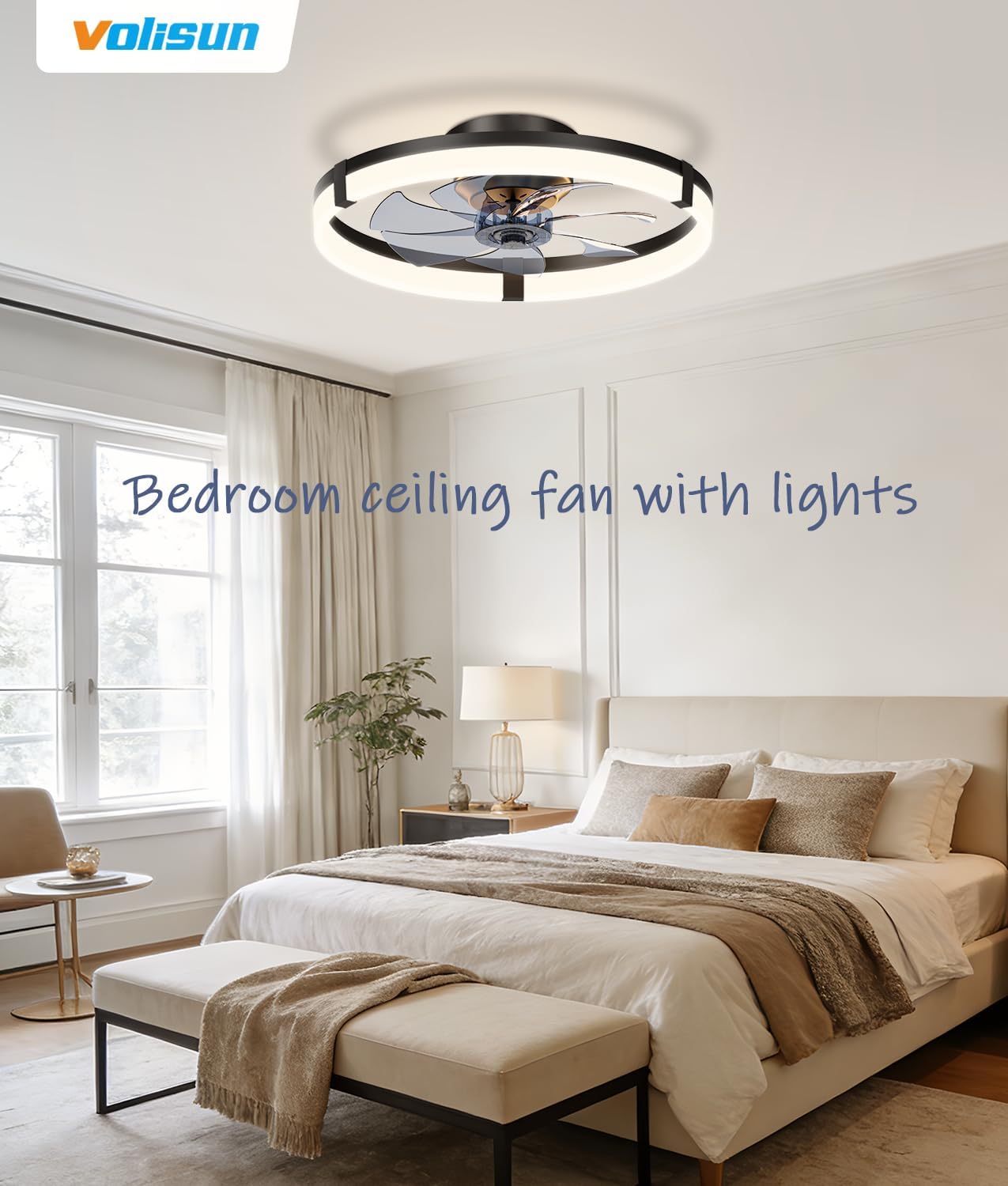 VOLISUN Low Profile Ceiling Fans with Lights and Remote, Flush Mount Ceiling Fans with Light, 3000K-6500K Dimmable Fandelier LED Fan Light, Bladeless Ceiling Fans with Lights for Bedroom